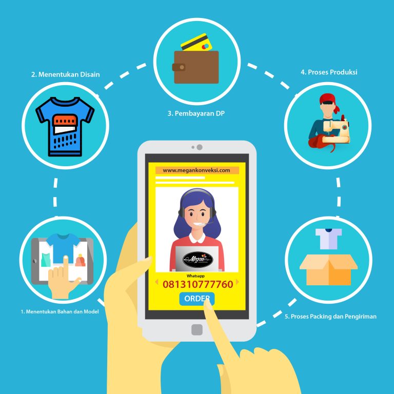 - Pemesanan dapat dilakukan melalui telepon, email, whatsapp, atau langsung datang ke workshop Megan Konveksi.